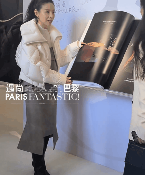 她在Margiela的走秀上被拍到一袭黑色宽肩轻纱连衣裙,肩部结构明显,裙摆轻盈,红色皮手套像点睛之笔;在波司登现场又换了浅灰色套装配白色短款羽绒,黑色长筒靴和高马尾把实用性和时髦感同时带到看台上。